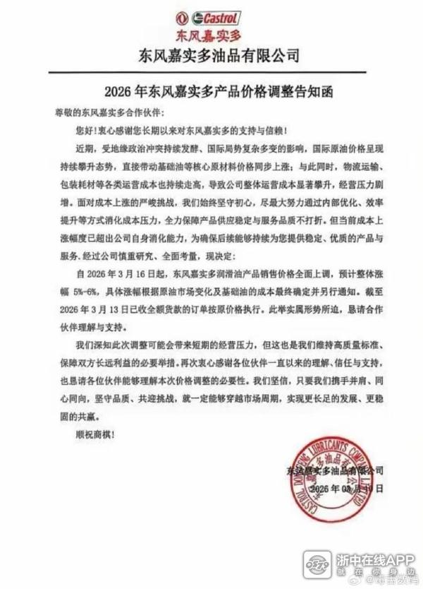 受国际原油及原材料成本大幅上涨影响,近期,多个成品油品牌先后迎来涨价。据统计,截至目前,已有美孚、壳牌、嘉实多、长城等十余个国内外品牌宣布上调价格,涨幅普遍在5%-10%之间。进入4月,车用机油、润滑油将迎来一轮涨价窗口期,也将导致养车成本的上涨。