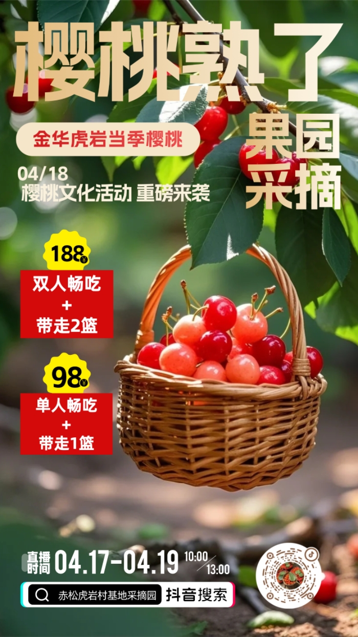 奔赴虎岩村樱桃种植基地,沉浸式解锁春日采摘乐趣。无论是温馨亲子家庭,还是活力青年群体,都能漫步果香满满的樱桃园,穿梭枝叶之间,亲手采摘枝头饱满红润的新鲜樱桃,近距离感受田园风光、体验农耕野趣。