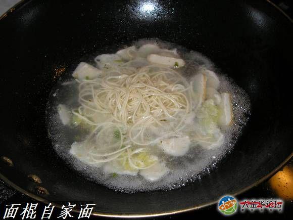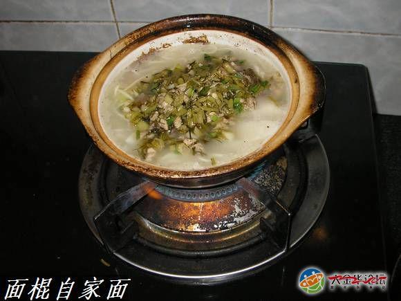 用黄芽菜和鱼肉吊出来的海鲜老汤此时派上了用处,不添加水,直接用老汤下面,煮到90%左走熟添加浇头,这时候我该用小砂锅做最后的炊具,收拢汤汁和聚集香味就靠这东西了!