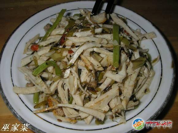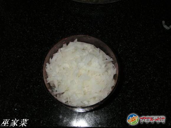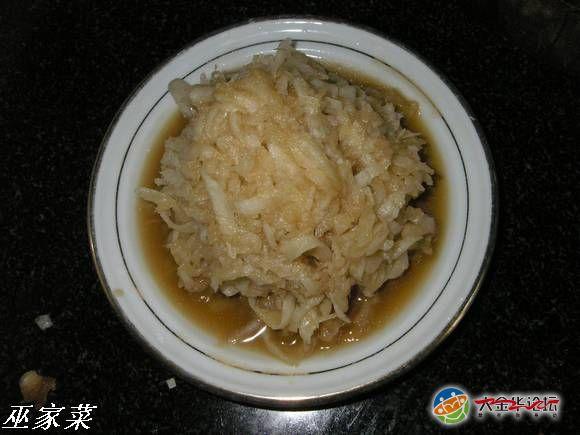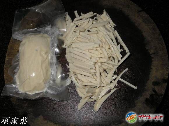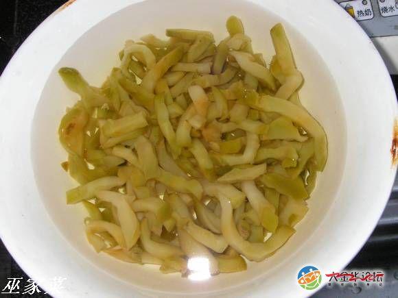 榨菜肉丝。这东西是我的四大金刚之一,出差回金必吃、天气骤变必吃、心情特好必吃、大病初愈必吃、有事没事还是吃!市面上有两类榨菜,一类是新榨菜,另一类是老榨菜。配粥,过泡饭应选择新嫩的榨菜,虽说是新榨,也是腌制过的,须在清水中浸泡至便面无咸味,咀嚼时有咸香即可!总是在清水中浸泡时间稍微长点吧!