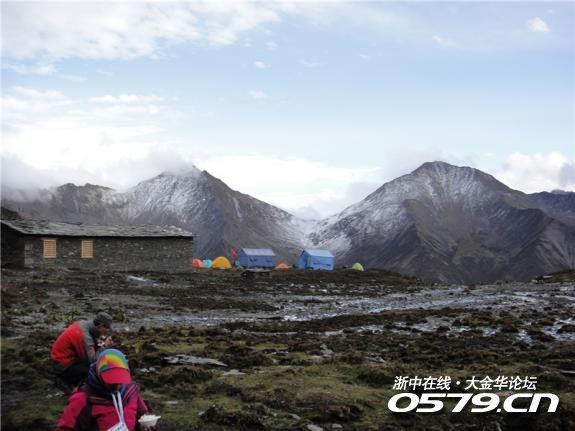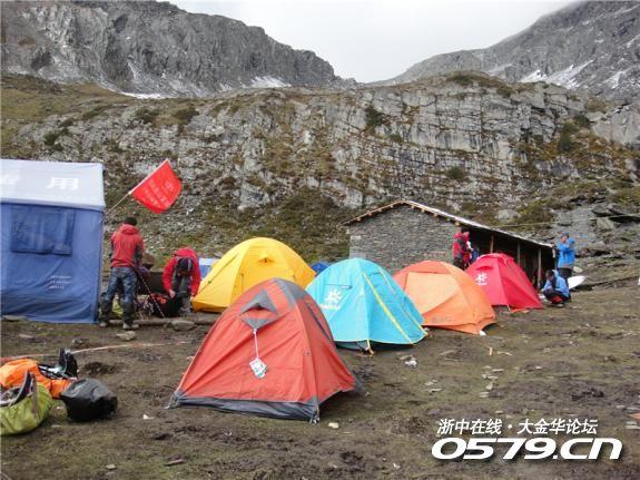 所谓大本营实际上就是大峰脚下的一块相对比较平整,可以扎营的地方,同时附近有水源。在这几乎都不长草的高山上,石头缝里能冒出水来,而且能汇集成一条不小的溪流。七个半小时的高山行军,似乎用完了全部的力气,支起帐篷后我便一头钻进去,倒在了防潮垫上再也不想动弹。都说高山寒冷,一般海拔上升一千米气温平均下降五度左右。但我们在大本营强烈紫外线的日照下,并不感到十分寒冷,但当太阳刚刚从周边怪石嶙峋的山岗上消失后,很快就感受到一种刺骨的寒冷。疲劳和寒冷使我们早早地钻进帐篷里的睡袋,但头疼脑胀得根本睡不着,半夜突然下起大雪》》》》》》