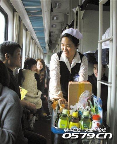 2011年2月8日,青岛至哈尔滨的K702次列车上,一名乘务员在卖水。马成军 摄