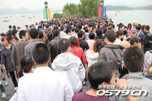 盛况:10月3日下午,西湖景区人流量达到86.98万。据报道,一分钟内来往人数就达到700人。这么多双脚在断桥上面,有人戏称,这下子断桥真的要断了。