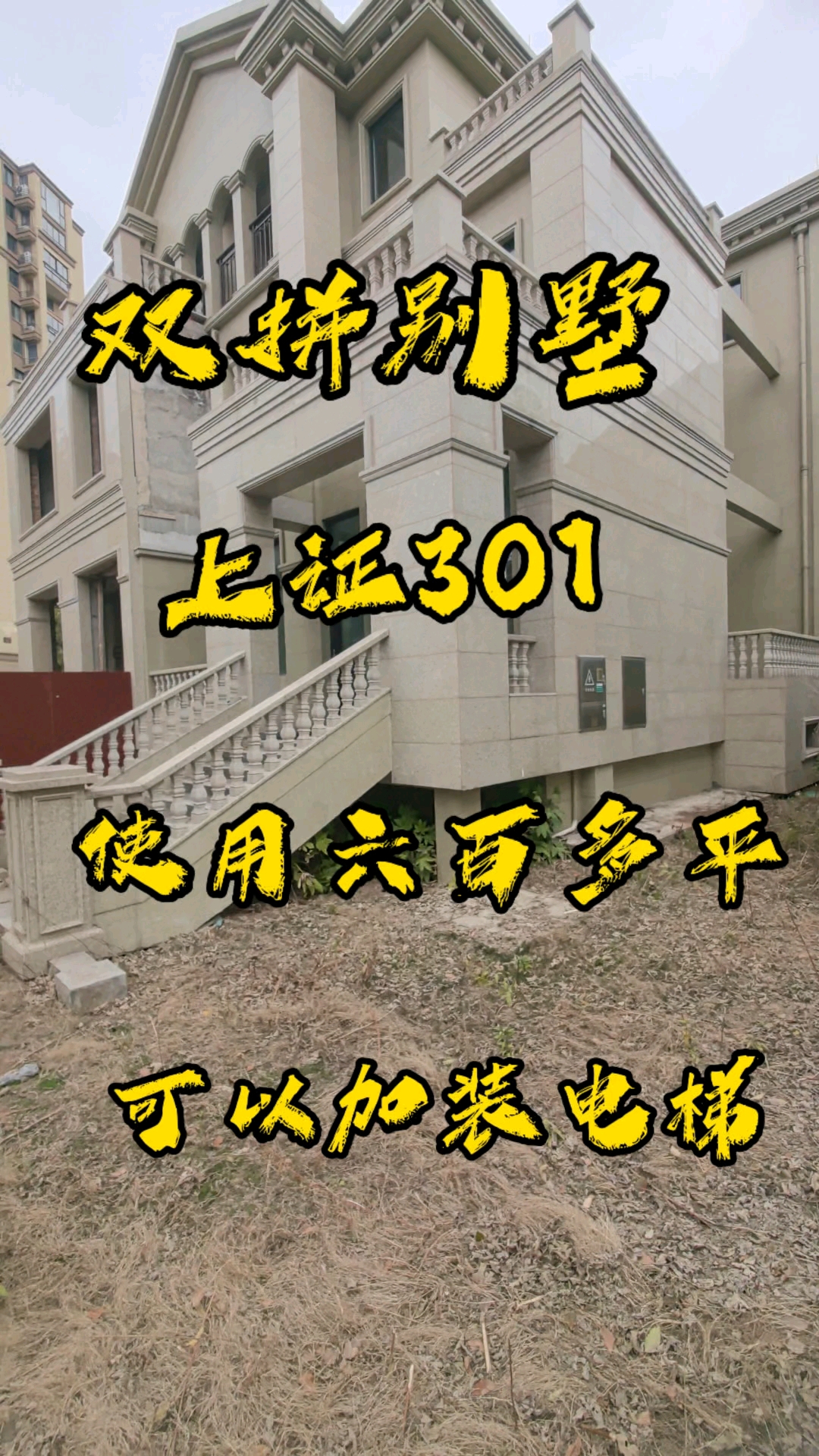 双拼大别野,使用五百多平,446个,干挂石材外立面,环绕式大花园,可以加装电梯