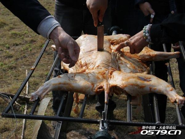 烤熟后抬下烤架,大家拿着碗围着,大快朵颐,味道远比想象的超级好吃,味蕾刺激、心花怒放要兴奋尖叫……不足10来分钟,分享只剩下一点点羊脊椎了,太爽歪歪了。感谢龙哥的精美厨艺展示,倾情奉献(据说此烤架已经烹饪烤制近30头羊了,难怪厨艺娴熟)让我们大家品尝传说中又鲜美,又嫩滑,又可口难忘的FB(腐败)全羊宴。