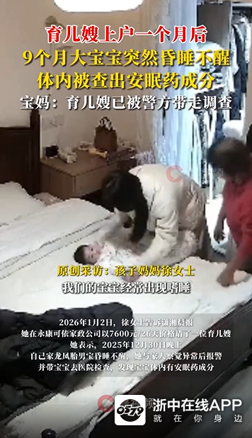 2026年1月2日,徐女士告诉记者,她在永康可依家政公司以7600元/26天价格请了一位育儿嫂,她表示,2025年12月30日晚上,自己家龙凤胎男宝昏睡不醒,她与家人察觉异常后报警,并带宝宝去医院检查,发现体内有安眠药成分。
