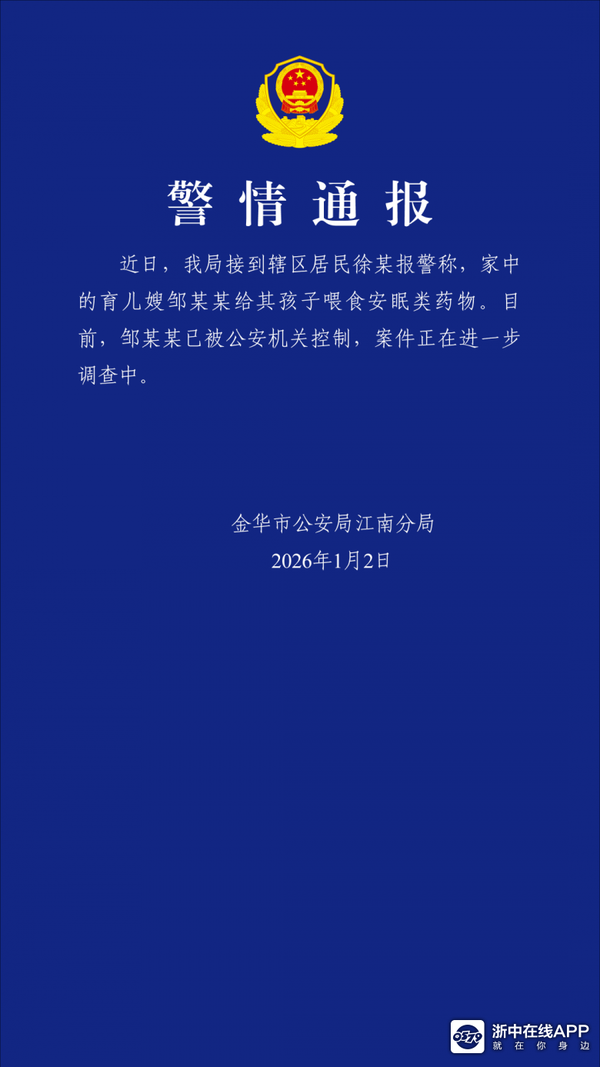 金华警方通报“育儿嫂给孩子喂食安眠类药物”:邹某某已被公安机关控制,案件正在进一步调查中