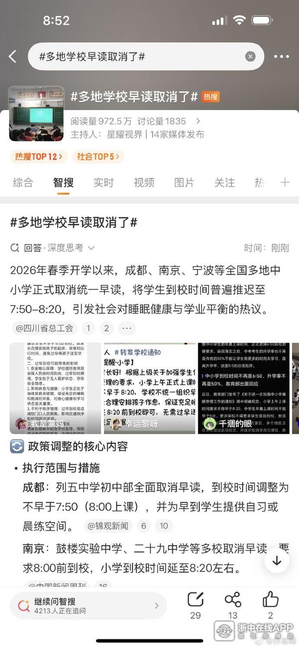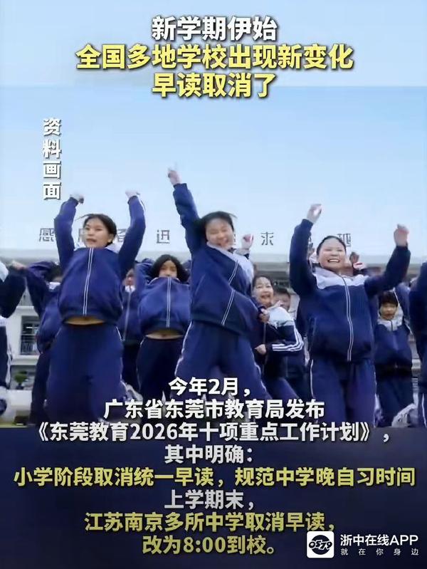 2026年春季开学以来,成都、南京、宁波等全国多地中小学正式取消统 一 早读,将学生到校时间普遍推迟至7:50-8:20,引发社会对睡眠健康与学业平衡的热议。